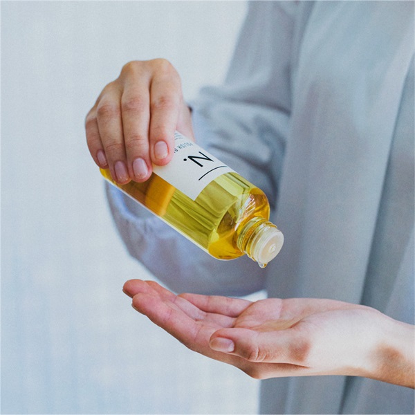 適量を手のひらにとり、両手をこすり合わせて指の間までよくのばします。毛先から手ぐしで溶かすように薄く均一になじませたら、残ったオイルで表面や前髪を整えます。